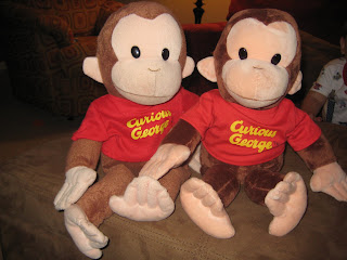 We now have 2 C.G.’s. C.G. stands for Curious George by the way. It’s amazing how many people don’t get that? I thought I would clarify. Plus, if you haven’t noticed I shorten everything as if I’m txting and if you ask my husband…he’ll tell you I even talk in text. Oops! Anyway, Papa ordered P his 2nd CG. We thought it would be more of a “back up” just in case something ever happens to CG #1, but as you can see below, P now thinks he has to carry around CG #1 AND CG #2. Dear Lord!
